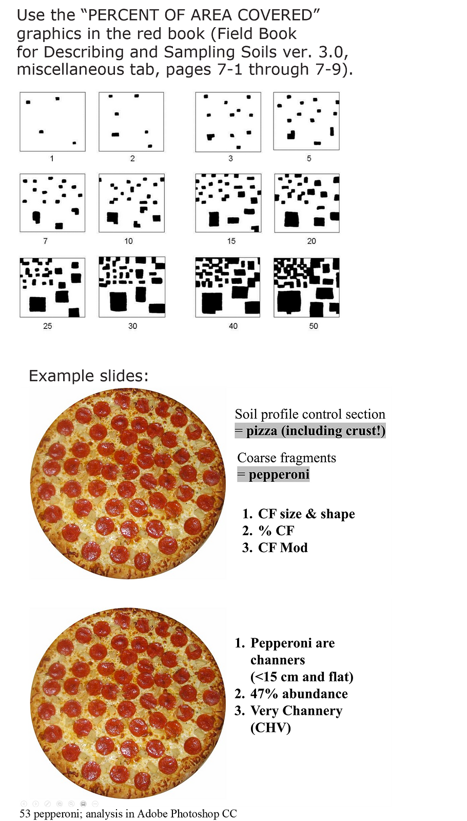 4. For each pizza, have the students give: (1) size, shape, and % rock fragments for each topping (2) Total %RF (3) RF modifier, if necessary, using the correct abbreviations