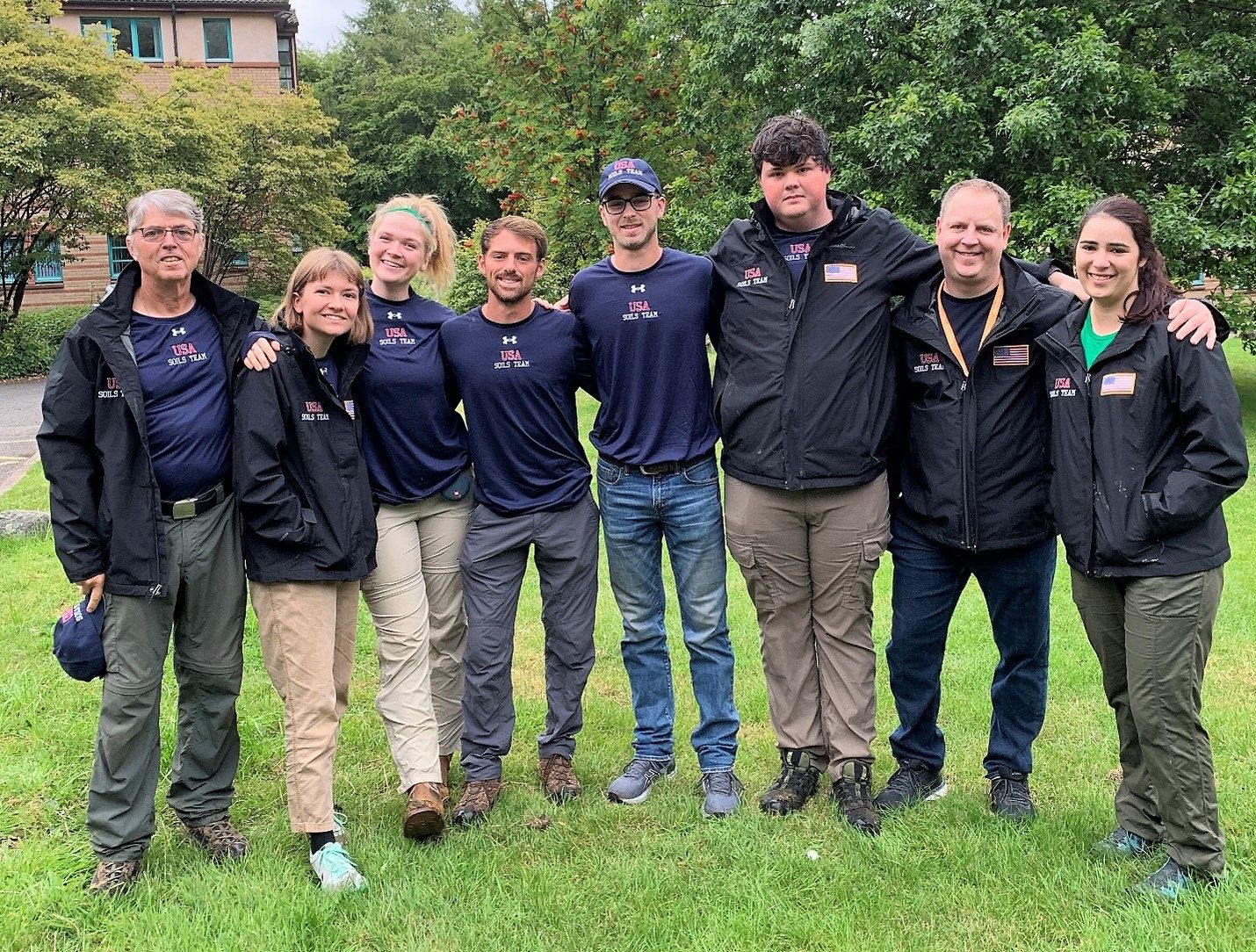 The International Soil Judging Contest occurs every four years in conjunction with the World Congress of Soil Science. Contestants are students and early career professionals. In the U.S., students qualify to be on the team by placing as the top finishers at the National Collegiate Soils Contest sponsored by the Soil Science and Agronomy Societies of America. The student representatives were Ben Atkins (Virginia Tech), Curtis Murphy (North Carolina State University), Isaac Nollen (University of Wisconsin, Platteville), Kennadi Griffis (University of Nebraska, Lincoln), and Clare Tallamy (Virginia Tech). Dr. John Galbraith and I were fortunate enough to serve as their coaches. The U.S. team, newly formed in April, studied soil classification and Scottish soils all summer. The first time we met in person was over a dinner of haggis, neeps, and tatties at the University of Stirling in late July.Â